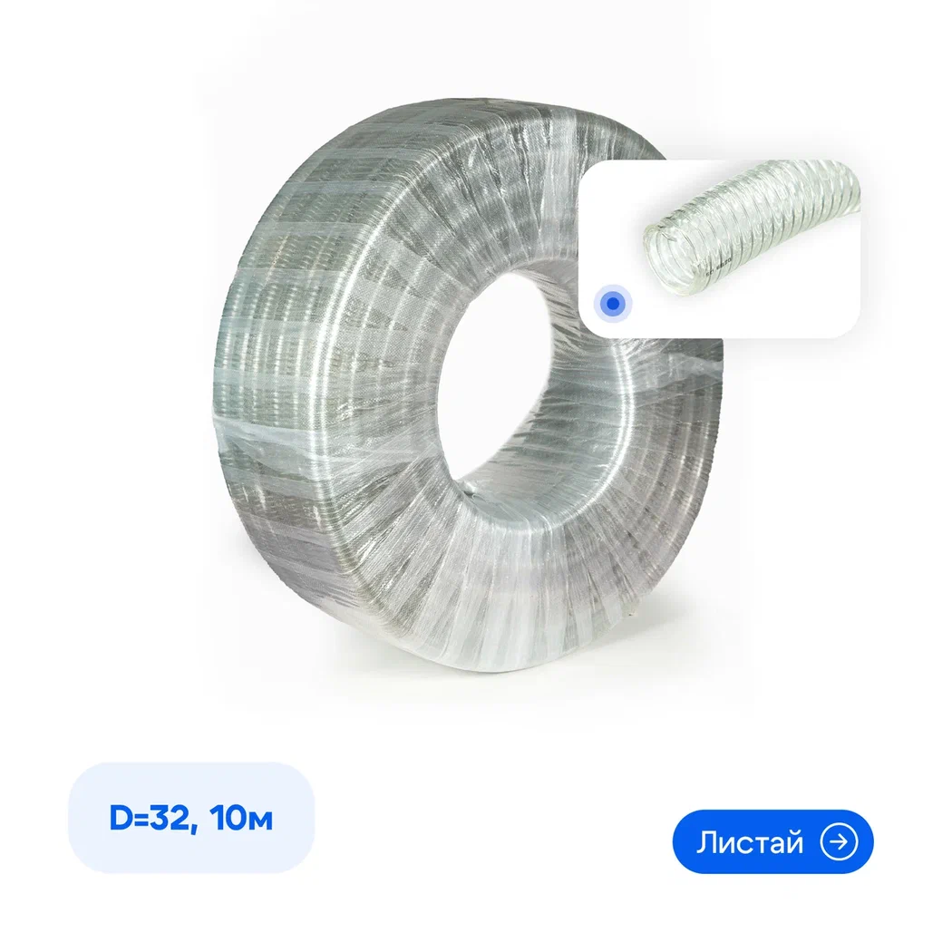 Внутреннее сечение шланга составляет 32 мм. Это значит, что он способен пропускать большие объемы жидкости, что является ключевым аспектом для многих его применений. При этом главный параметр — длина шланга — составляет 10 метров, что делает его удобным для работы на средних расстояниях и в условиях ограниченного пространства. Внешний диаметр у шланга 32x40 мм, что также имеет важное значение, так как это влияет на возможность подключения к различным насосам и другим устройствам.