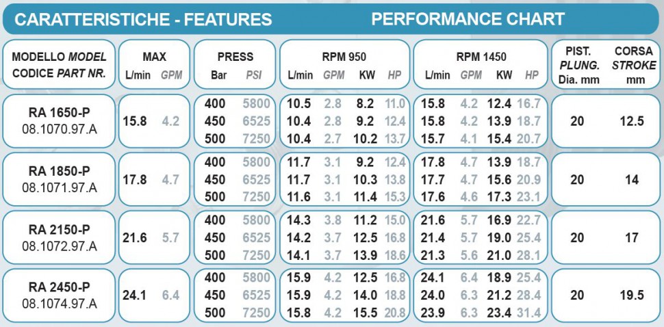 Трехплунжерный насос Bertolini RA 1850-P имеет производительность 18 литров в минуту и максимальное давление в 500 бар. Это делает его идеальным выбором для задач, требующих высокой мощности и надежности.