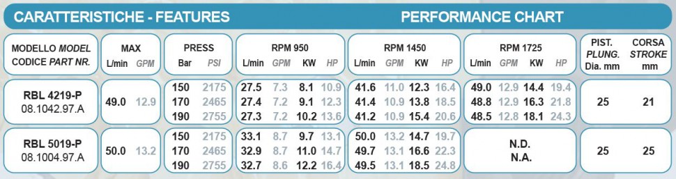 Трехплунжерный насос Bertolini RBL 4219-P имеет производительность 42 литров в минуту и максимальное давление в 190 бар. Это делает его идеальным выбором для задач, требующих высокой мощности и надежности.