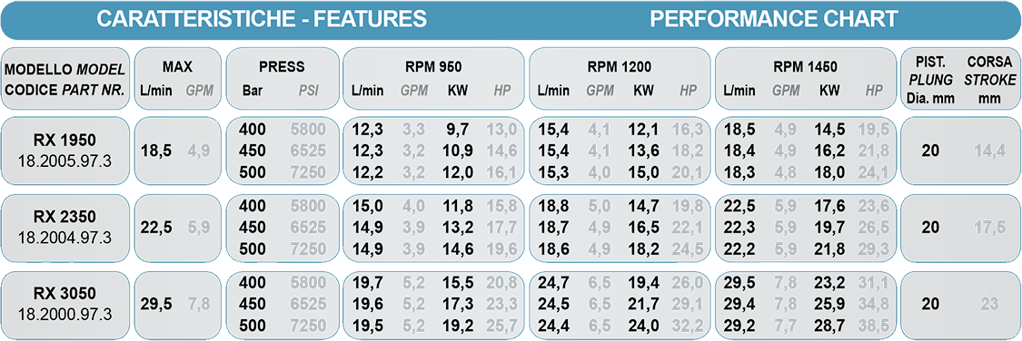 Трехплунжерный насос Bertolini RX 1950 имеет производительность 19 литров в минуту и максимальное давление в 500 бар. Это делает его идеальным выбором для задач, требующих высокой мощности и надежности.
