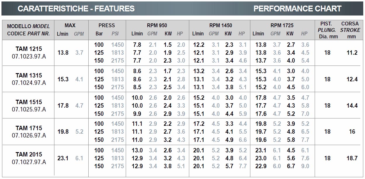 Трехплунжерный насос Bertolini TAM 2015 имеет производительность 20 литров в минуту и максимальное давление в 150 бар. Это делает его идеальным выбором для задач, требующих высокой мощности и надежности.
