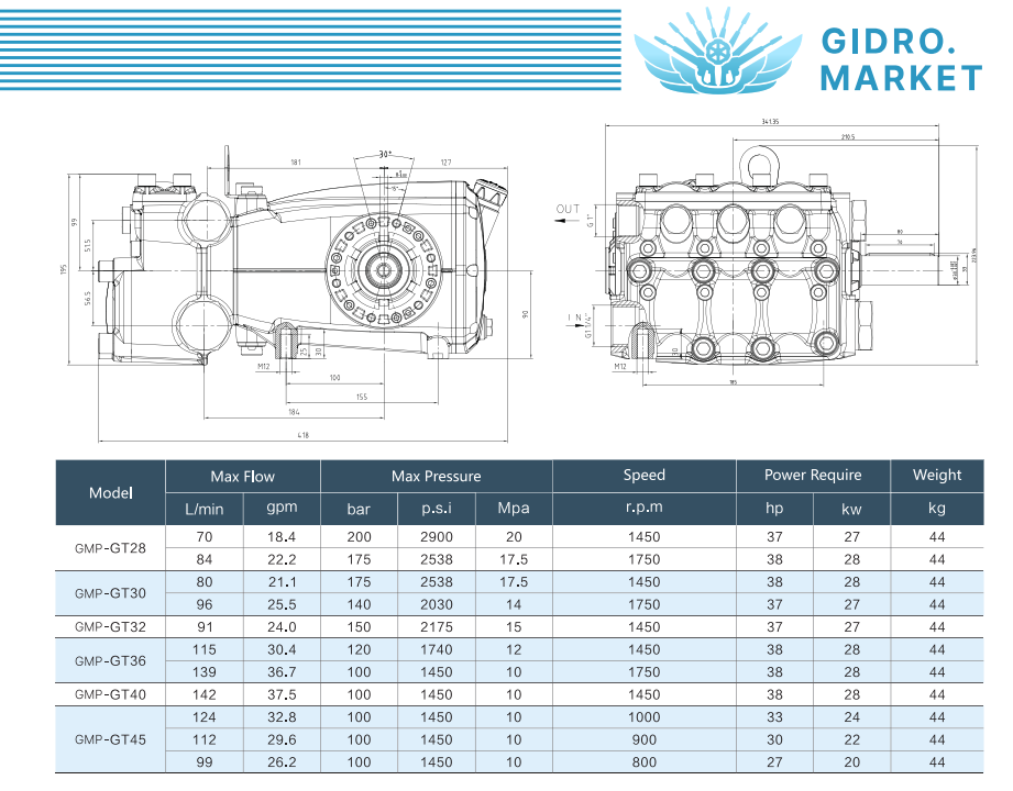 Промышленный насос GM Pumps GT32, представляет собой трехплунжерный насос высокого давления, способный обеспечивать мощность до 100 литров в минуту и давление до 150 бар.