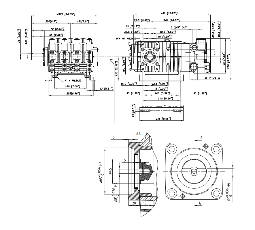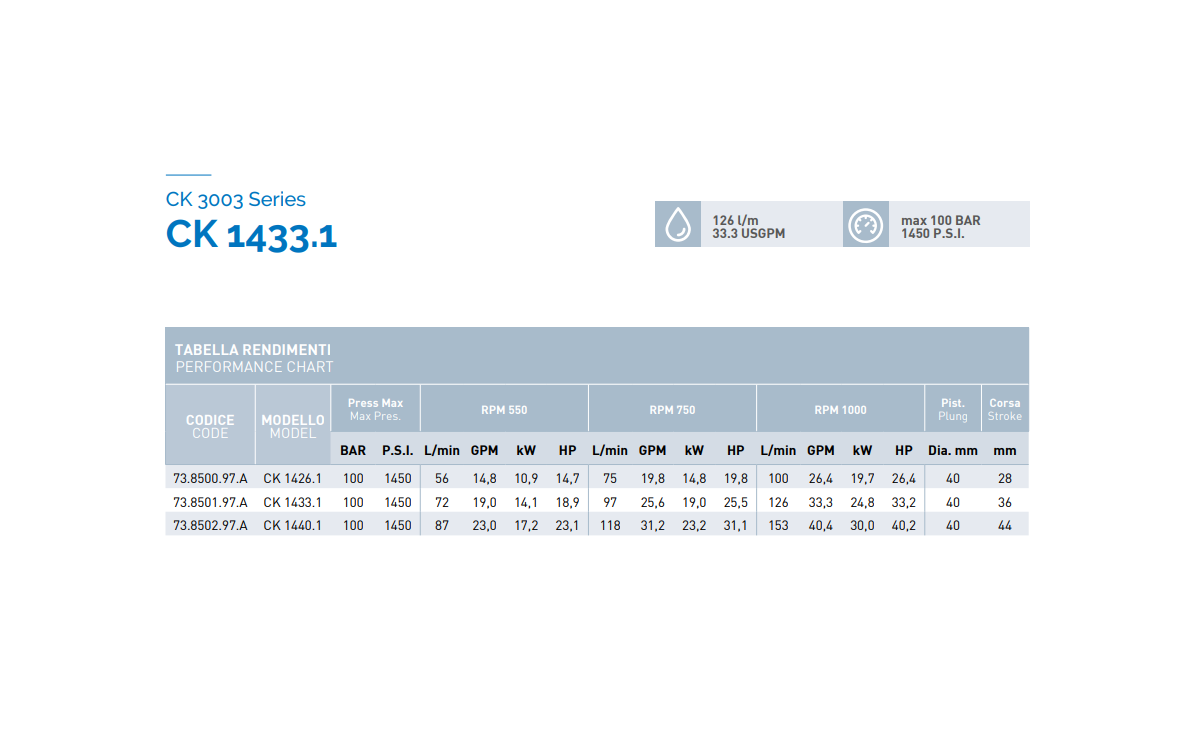 Трехплунжерный насос Bertolini CK 1433.1 имеет производительность 126 литров в минуту и максимальное давление в 100 бар. Это делает его идеальным выбором для задач, требующих высокой мощности и надежности.